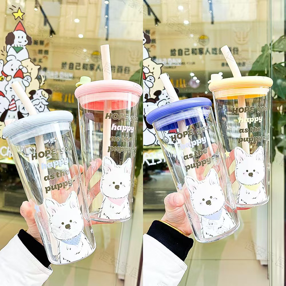 かわいい子犬のグラス大容量2025新型学生高颜値コップストロー付き夏コップ携帯