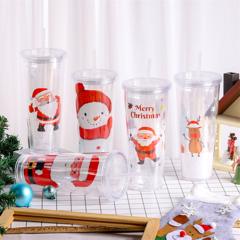 クリスマスシリーズプラスチックカップ二重蓋付きストローカップ漫画クリエイティブサンタクロースカップ卸売り