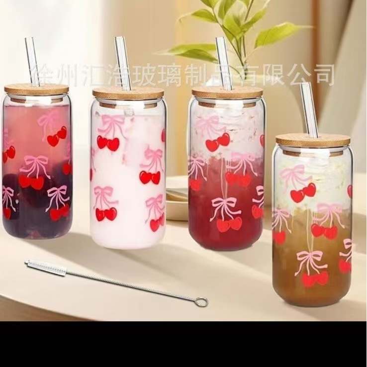 Ins高颜値フランス飲料ストローカップコーヒーミルクティー冷たい飲み物カップネット赤蓋付きガラスカップ高温