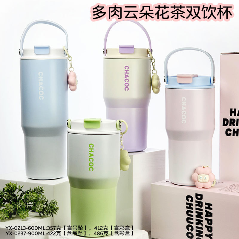 高颜値多肉云花茶杯ステンレス保温カップ女子ダブルドリンクカップストロー付き学生水カップ