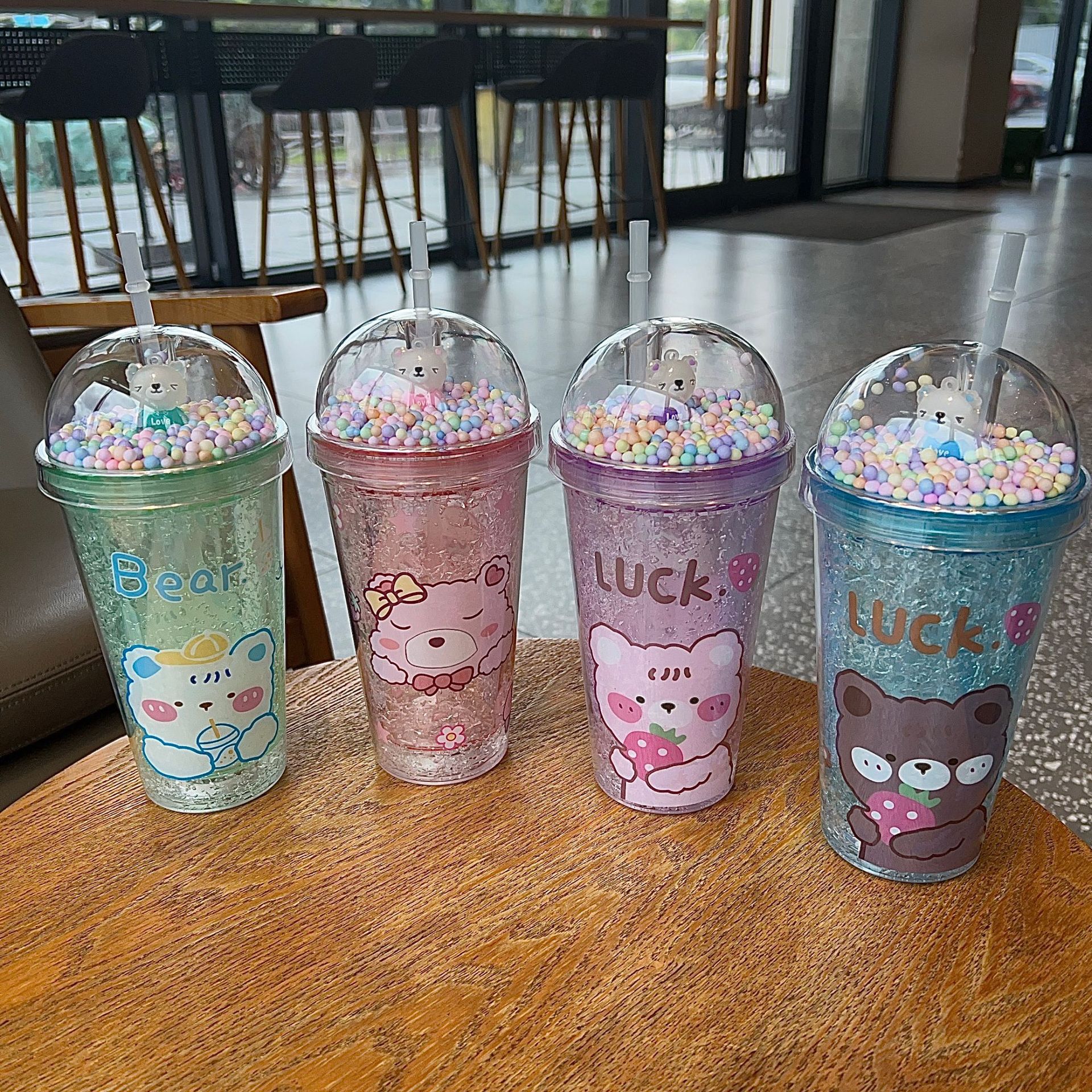 プラスチックストローアイスカップ萌え熊アニメプラスチックカップ二重カップスパンコール砕氷カップ国境を越えた新しい高颜値