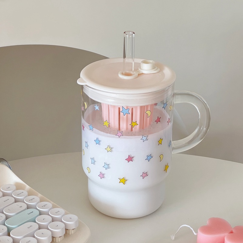オリジナル星ガラスストローカップ高ホウ素シリコン大容量水コップ女子グラスハンドルストローカップ付き