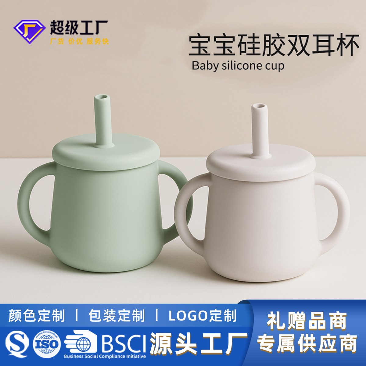 国境を越えた新しい食品グレードのシリコンストローカップ、子供用ウォーターカップ、赤ちゃん用学習カップ、落下防止ミルクカップ、授乳用食器