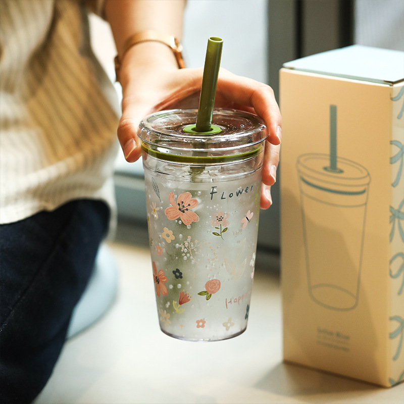 鉛フリーガラスストローカップ女子ins風コーヒー飲料ミルクティーカップ大容量カバー付き携帯増厚