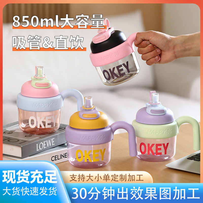 850ml带吸管水杯大容量带提手一体双饮杯婴幼材质防漏设计吸管杯