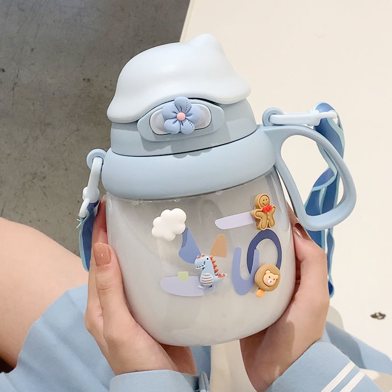 子供用高颜値ストラップ付きストローカップ大容量アニメカップ学生は斜めにタイプのストレートカップを飲んでいる