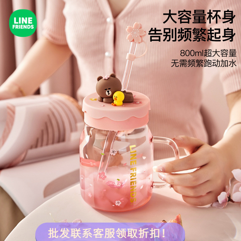 LINE FRIENDSガラスコップ女子児童夏大容量ストローコップ漫画桜大腹カップ