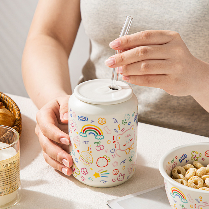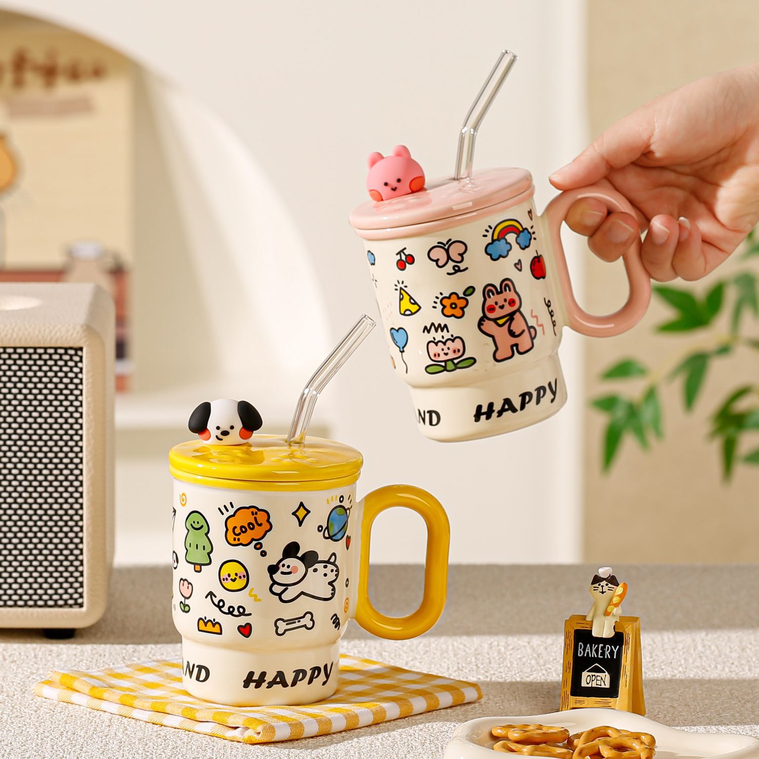 2025 夏の新ストローカップ落書き動物セラミック水カップ蓋付き漫画マグ水カップハイエンドかわいい