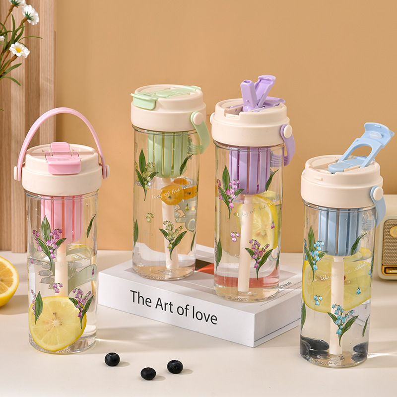 見栄えの良いスズランの花の夏用高温耐性飲料フルーツティーカップ、茶隔離付きダブルドリンク口、ポータブルハンドル付き直飲みカップ