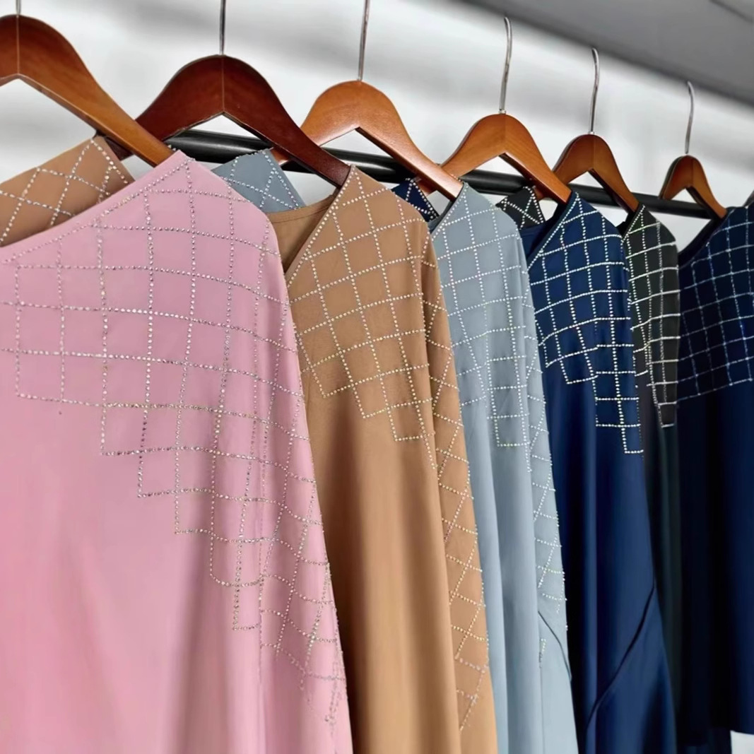 2025 夏の新アマゾンクロスボーダーシンプルなグリッドラインストーンホットダイヤモンドハイエンドファッションイスラム教徒ローブ女性のための