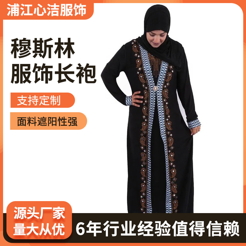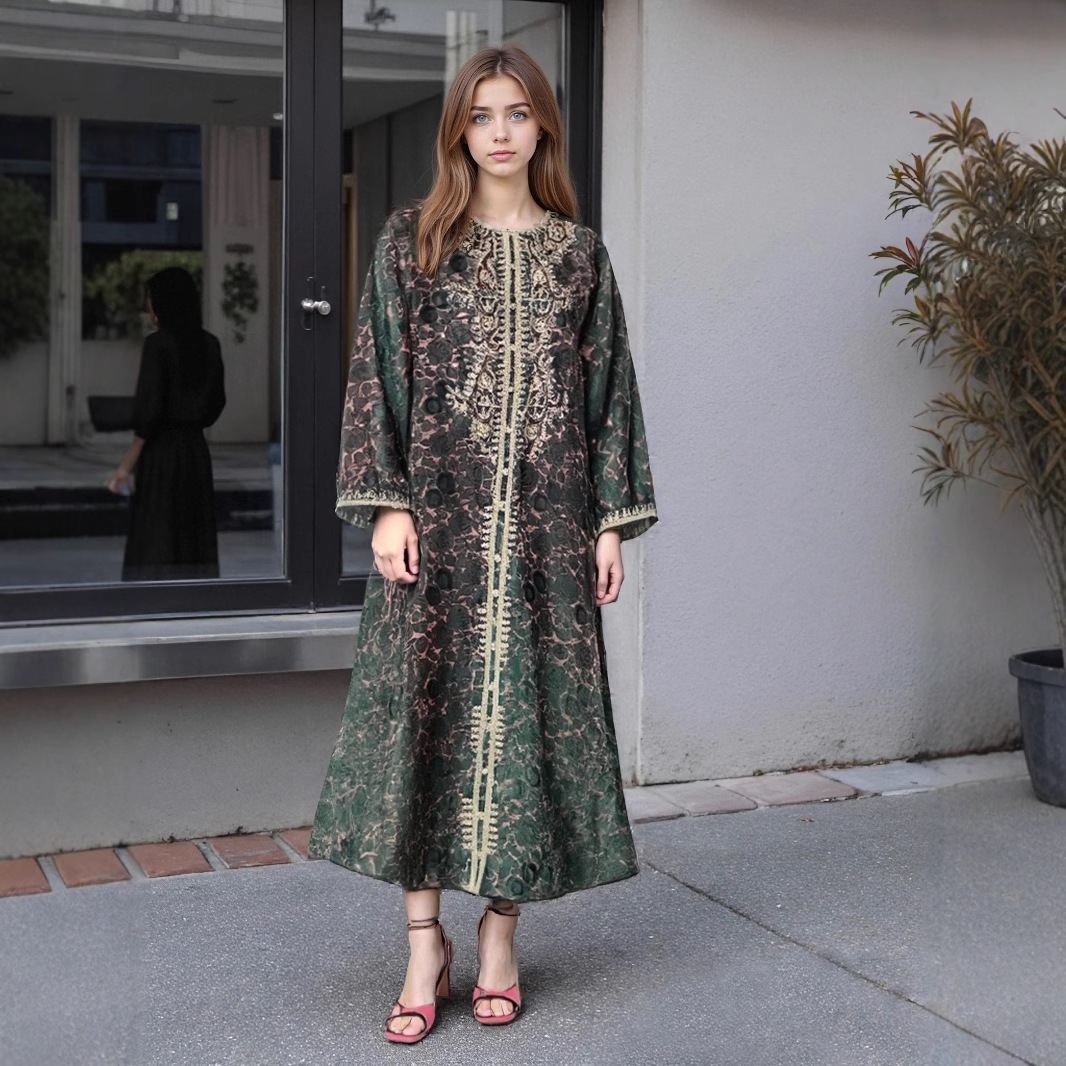 スポットクロスボーダー新スタイルローブプリント中東イスラム教徒マレーシアドレスフルスリーブラウンドネックローブロングスカート工場バッチ
