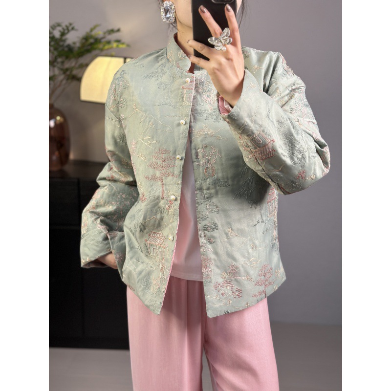 実拍2024春の新型中国式の古いお金の風の軽い国風の “あずまやの台の楼閣” の復古の刺繍のコートの女性