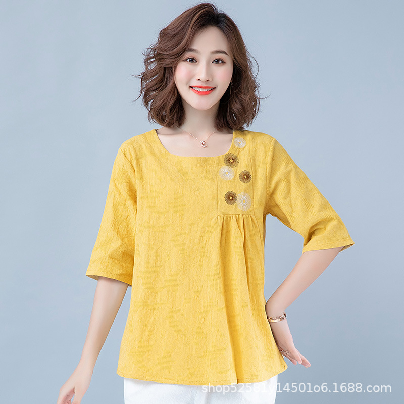 民国風復古綿麻刺繍tシャツ夏カジュアル中袖丸襟上着女装メーカー直販卸売り