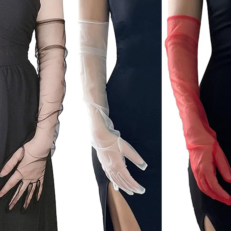 55CM長さ70CM DIY薄手のチュール無地ブライダルウェディングドレス手袋セクシーな黒白ワインレッドメッシュウェディング