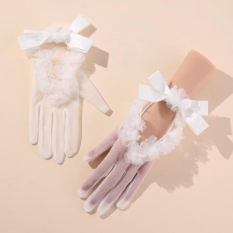 貿易ブライダルウェディングドレスレースメッシュショート薄い透明パールリボン手袋結婚式の写真撮影女性卸売