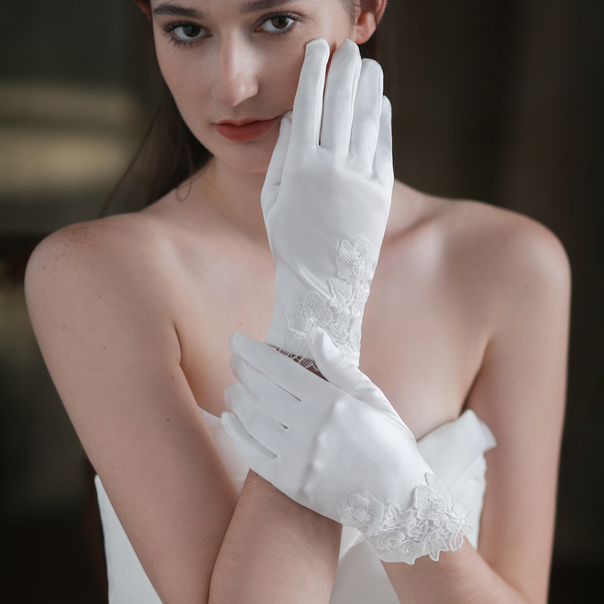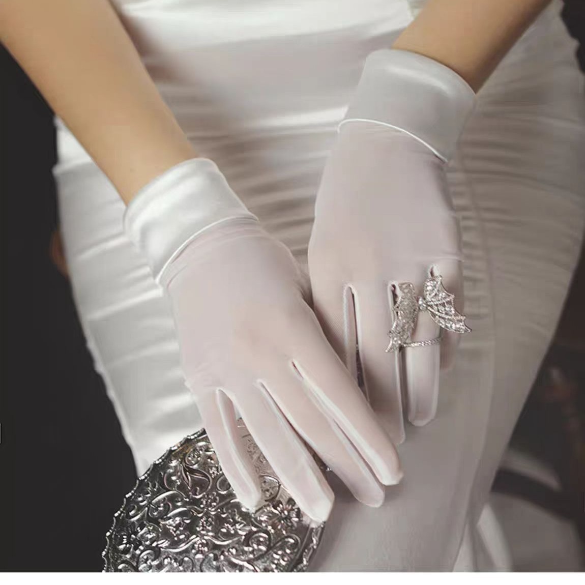 フランス式ウェディングドレスレトロ手袋花嫁结婚レースサテン写真撮影道具撮影ホワイト高级手袋