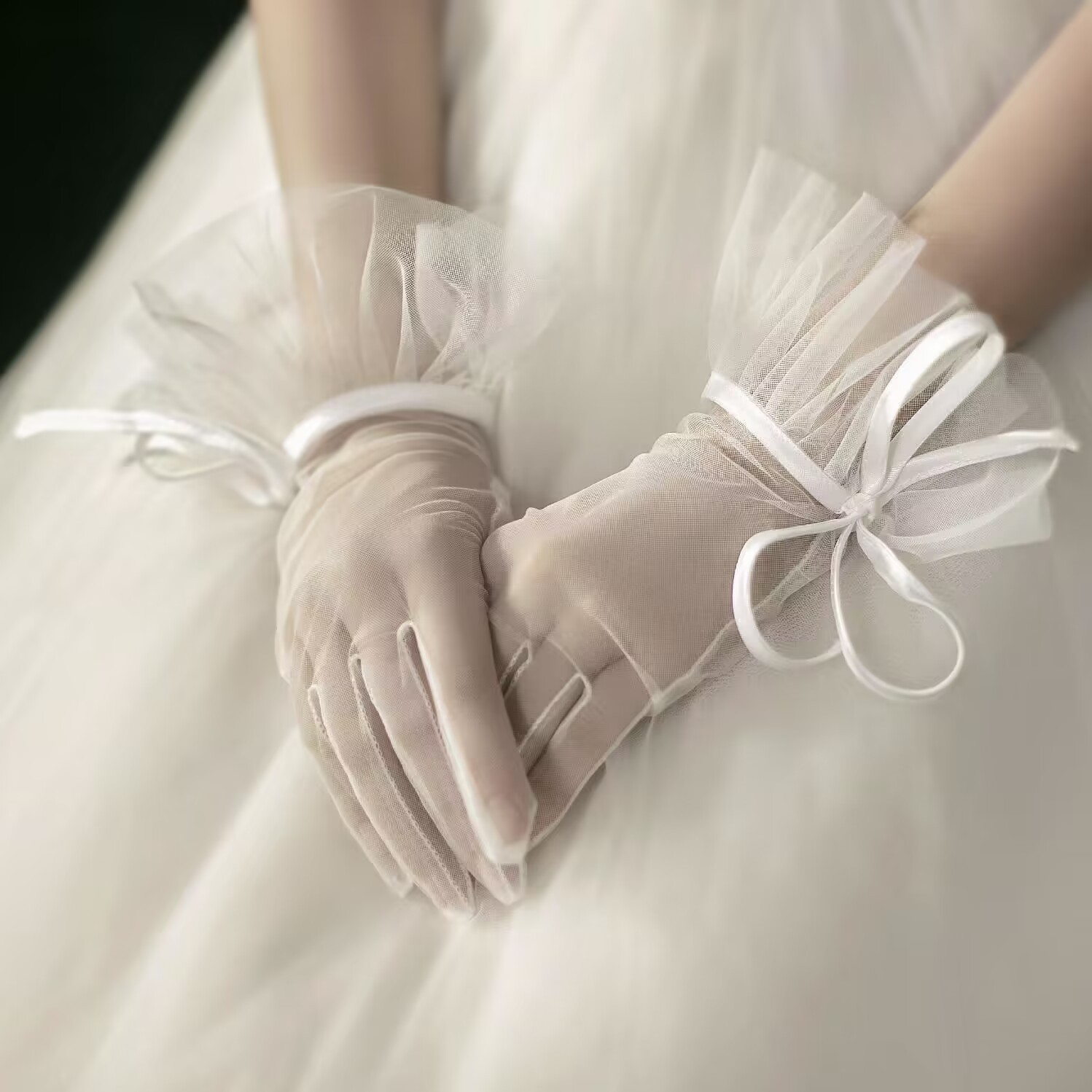 外国貿易のウェディングドレスの短い手袋の素の糸の透明な包みの辺はしわの長いリボンの蝶結びのdiyシンプルな白色を打ちます。