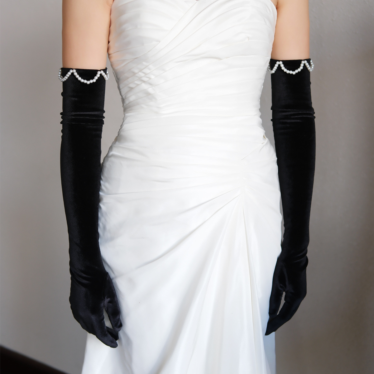 WG180 黒フレンチヘップバーンスタイルベルベット手袋ロングビーズ結婚式のイブニング写真小道具アクセサリー卸売