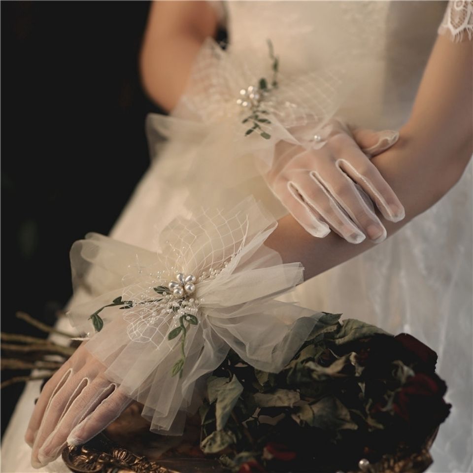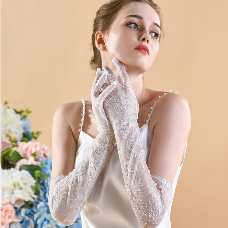 晩餐会パーティーステージ花嫁ウエディングドレスレース韓国式フレンチロング薄紗透明精緻レース手袋女性