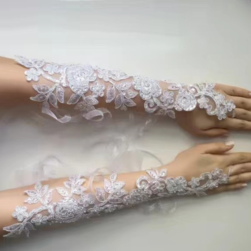 韓国式の花嫁の手袋の白い結婚のウェディングドレスの長いタイプのレースの刺繍の玉の露指の結婚式の手袋