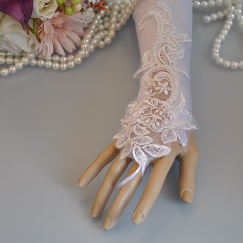 花嫁の結婚式の手袋レースの真珠の指の白い短いタイプの透かし彫りのレースの手袋のウェディングドレスの公演の手袋