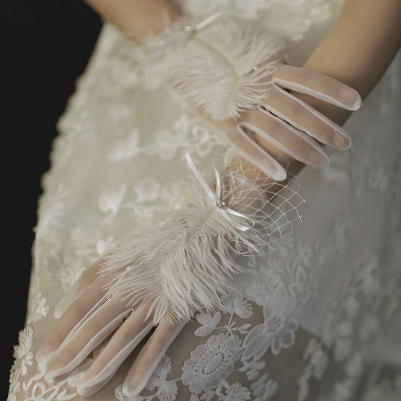 短い羽毛の花嫁の結婚の礼儀の手袋のウェディングドレスの羽毛の仙系の手袋は写真を撮影して飾ります。