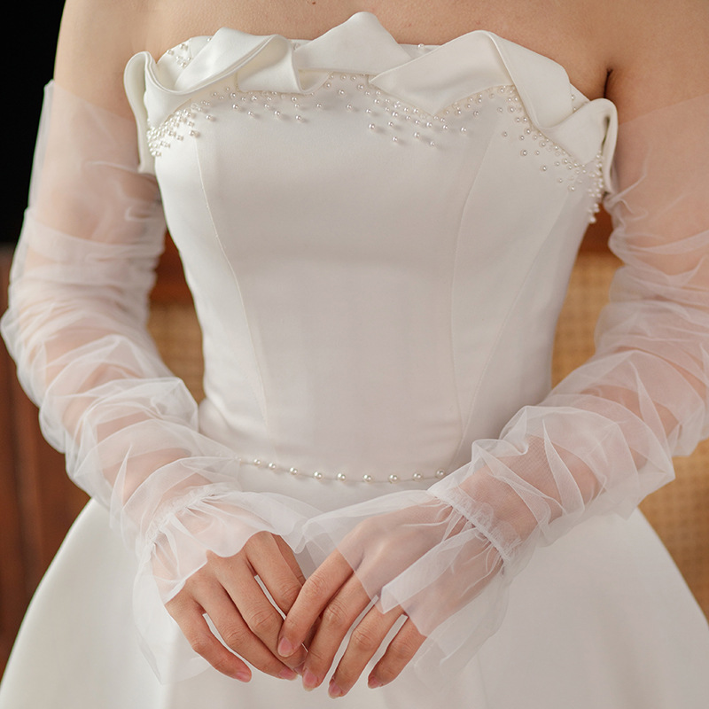 Wg078新作スリーブ白のシンプルでエレガントな花嫁ドレスパーティーパーティー透明な薄い糸の長い指なし手袋