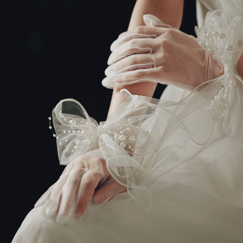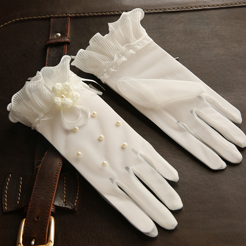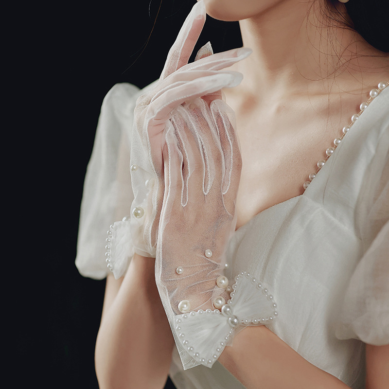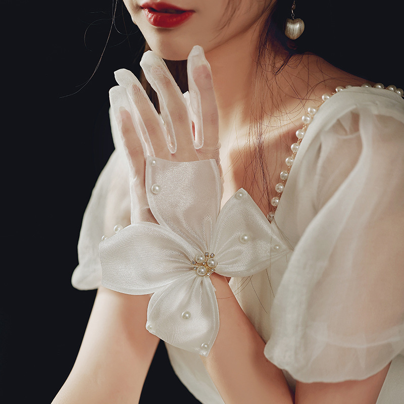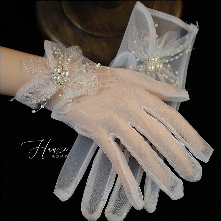 ウェディング写真手袋花嫁韓国式花真珠短森系超仙薄紗日焼け止め結婚式器女1123