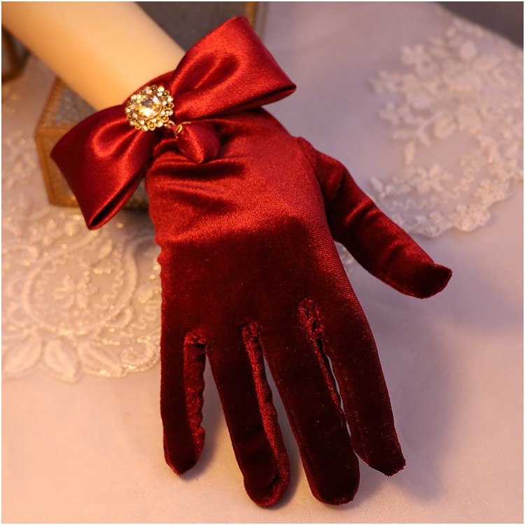 フランスのレトロなワインの赤いベルベットの蝶結びの花嫁のウェディングドレスの手袋の黒色のドリルは影楼のアクセサリーを飾ります。