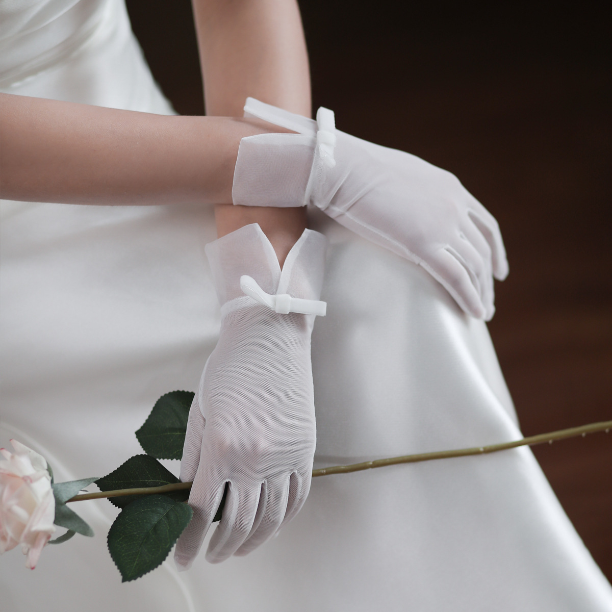 简约甜美短网纱蝴蝶结缝珠手套 新款新娘婚纱配饰轻柔网纱手套