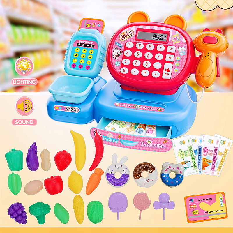 外国貿易の新型子供のままごとのレジのおもちゃのセットの多機能はスーパーマーケットのショッピングのレジの卸売りをシミュレーションします。