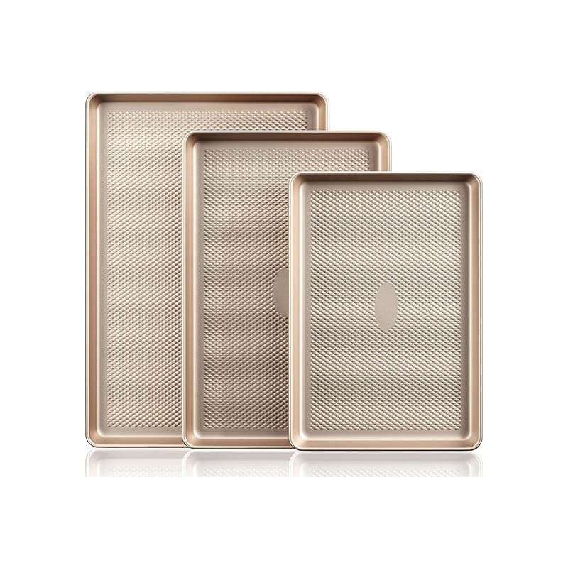 高品質炭素鋼エンボス浅皿格子模様ベーキングパン3点セット、厚手ノンスティック長方形ベーキングクッキーケーキ型