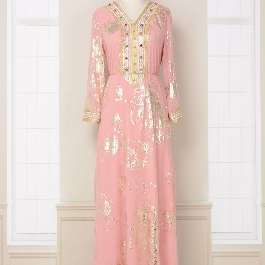 Mt085越境中東2023春の新型ムスリム箔押しファッションガウンベルト付きピンクワンピース