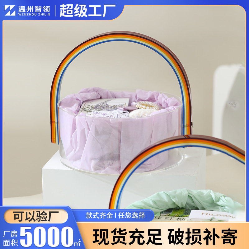 アクリル製ポータブル丸型中秋節ボックス、透明でクリエイティブなレインボーハンドル付き、ブライズメイドギフト、結婚式のキャンディボックス、ロゴ入り