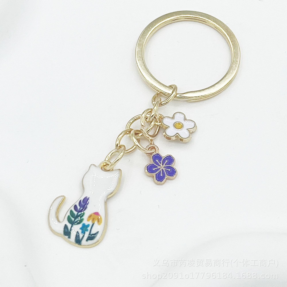 クロスボーダー個性派プリント猫と花キーホルダー、オイルドリップキーチェーン、女性用バッグ飾り、車の鍵