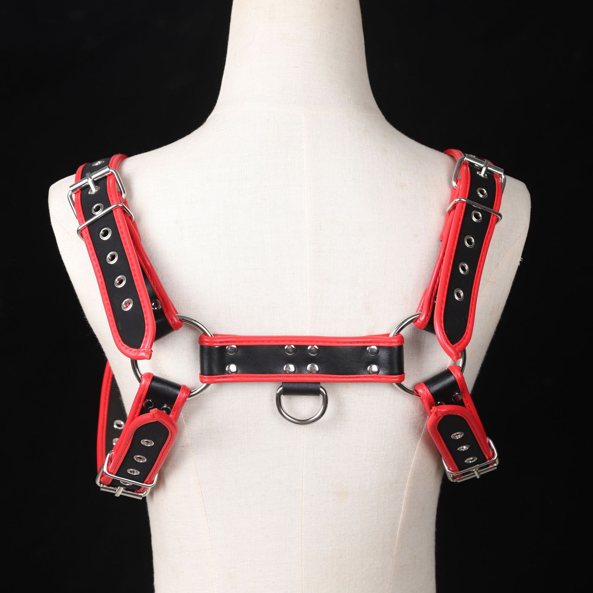 夫婦用品の趣味性のおもちゃは皮革の赤と黒のsmを代行してpuの猛男を縛ります。