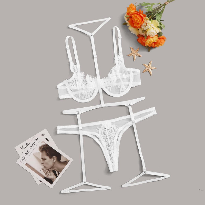 美しい女性の薄いレースのワイヤー入りライト高級シースルーブラセットローカットセクシーなランジェリーブラジャーとガーター