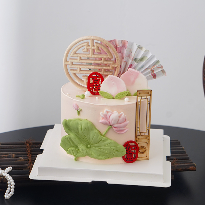 新中国風国潮風誕生日ケーキ装飾木製吉祥屏風プラグイン蓮の花シリカゲル老人過寿