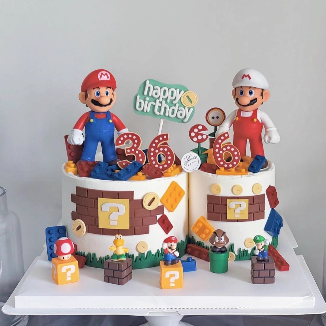 スーパーマリーケーキの装飾はマリオ漫画の子供の男の子の誕生日パーティーのデザート台のプラグインを挿します。