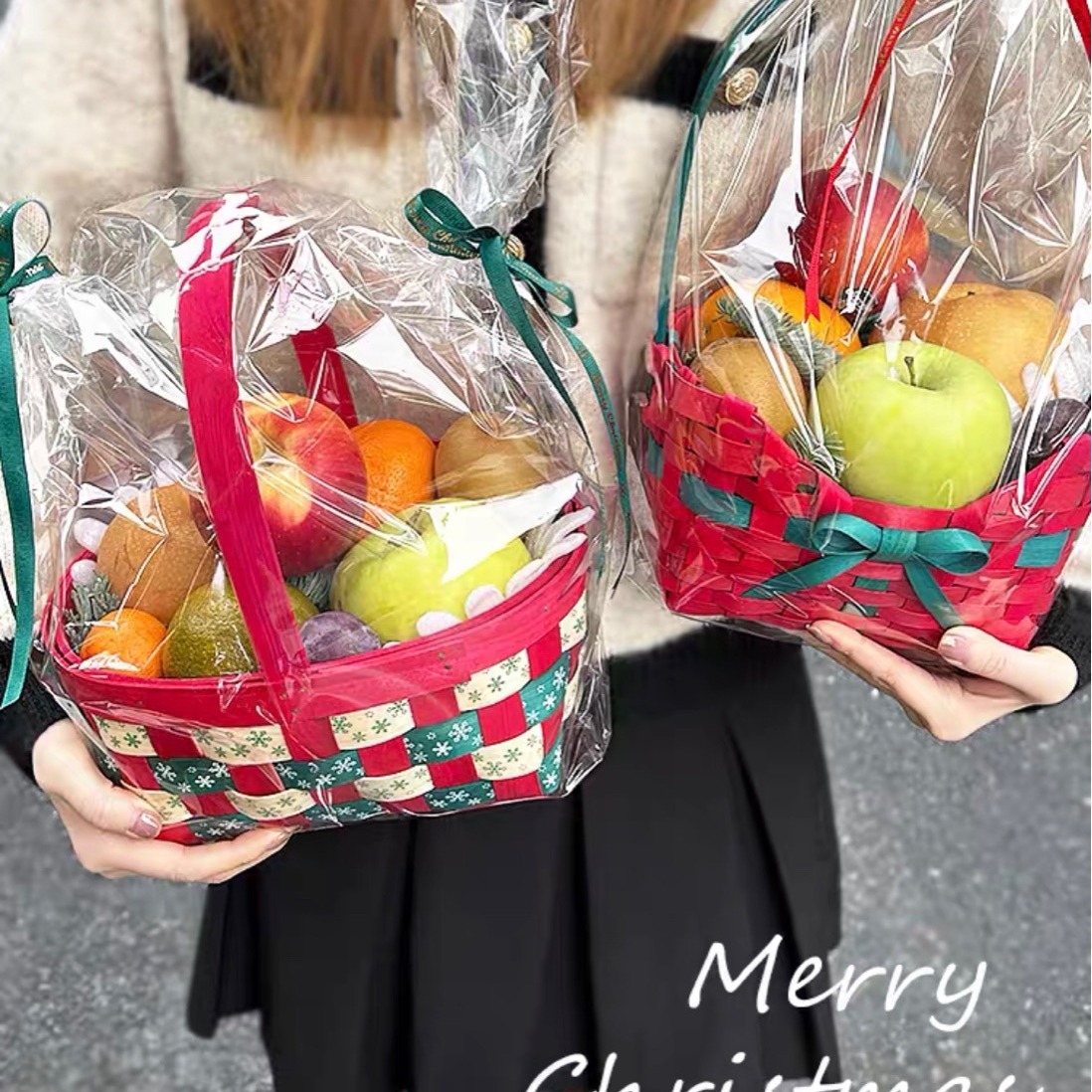 38節の果物の花かごの蝶結びのクリスマスイブの雪の花の贈り物の包装の手提げかごのリンゴの贈り物のかごの木製