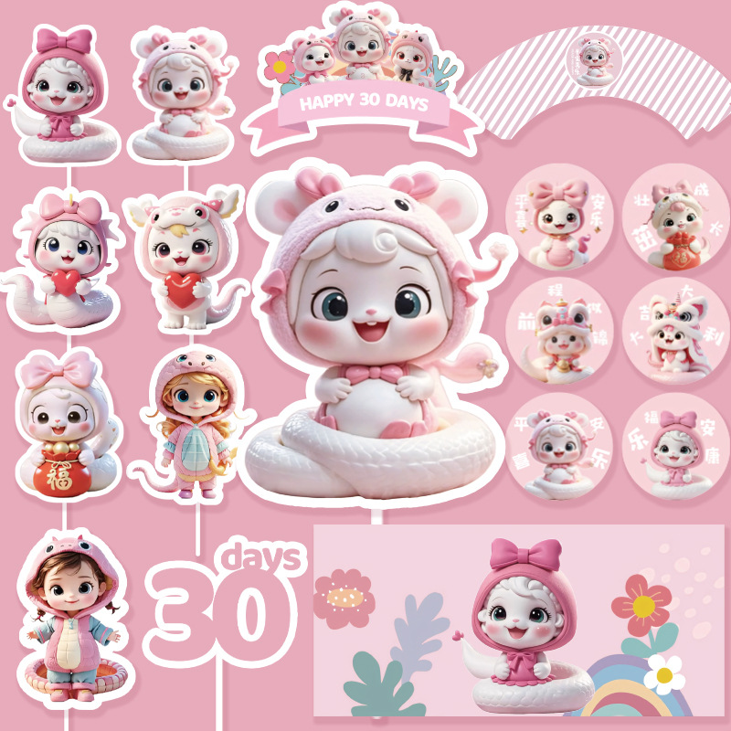 蛇の赤ちゃんの満月の30日の歳の百日のデザートの台のケーキの装飾のプラグインのピンク系のケーキは札を挿します