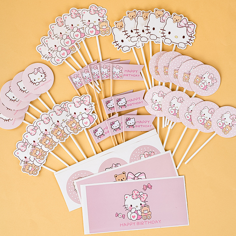 ピンクの子猫のテーマの女の子の誕生日満月の宴の装飾のデザートの台のプリンのシールは押して楽のケーキを押して挿します。