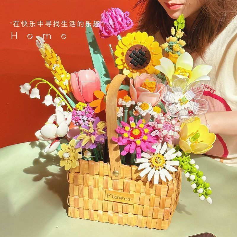 フェミビルディングブロックフラワーバスケットローズデイジーひまわりクリエイティブホーム絶妙なリビングルームの装飾品ガールフレンドの花束