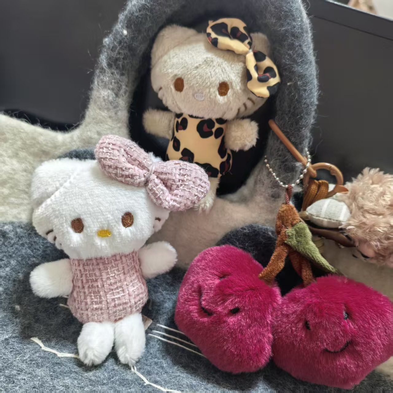 大衆がデザインしたヒョウ柄kittyぬいぐるみ黒皮ストラップバッグktかばん人形キーホルダー飾り