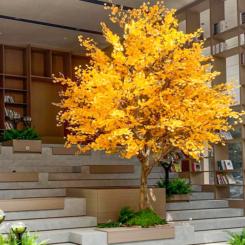 イチョウの木の黄色の偽の木の室内の外の新年のショーウインドーの柔らかい服の緑の真の木の装飾の造景のホテルの置物をシミュレーションします。