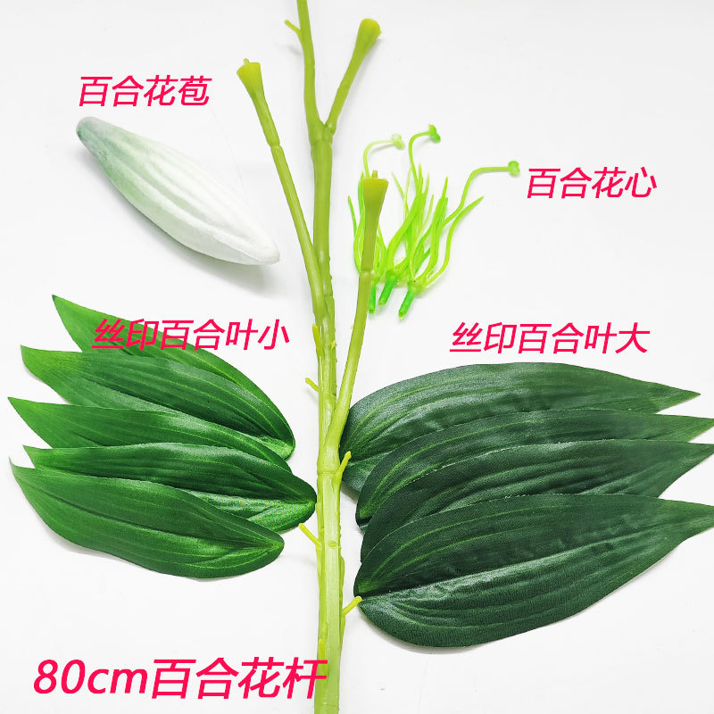 大きなユリの茎、ユリの花芯、花のつぼみ、シルクプリントのユリの葉、プラスチックで覆われた鉄線、ユリの茎、緑の植物