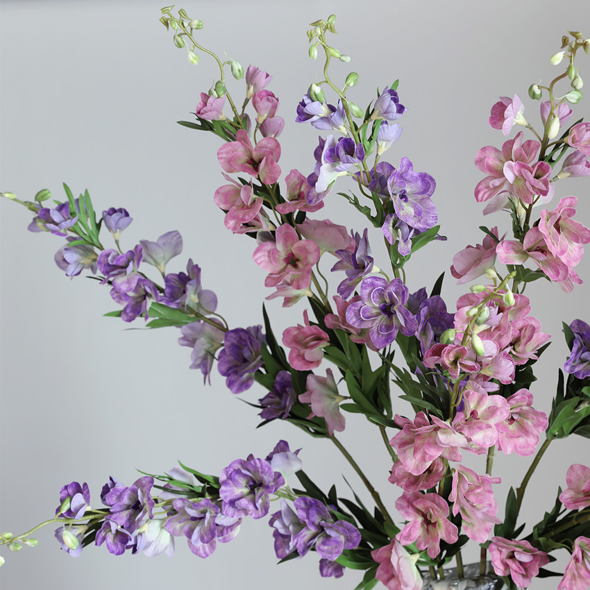 模造花飛燕草テープ手触り印刷偽花家庭装飾結婚式堂に紫系長枝花を配置する