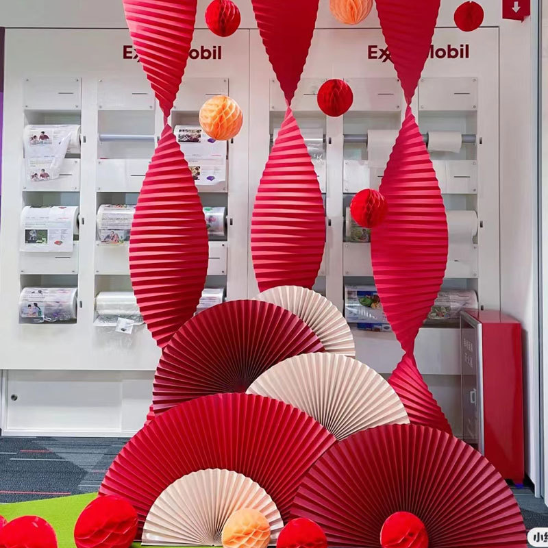 赤い結婚式の長い段ボールの結婚式の現場の背景は春節のお祝いのショーウインドーの波の折り紙の道具の配置を飾ります。
