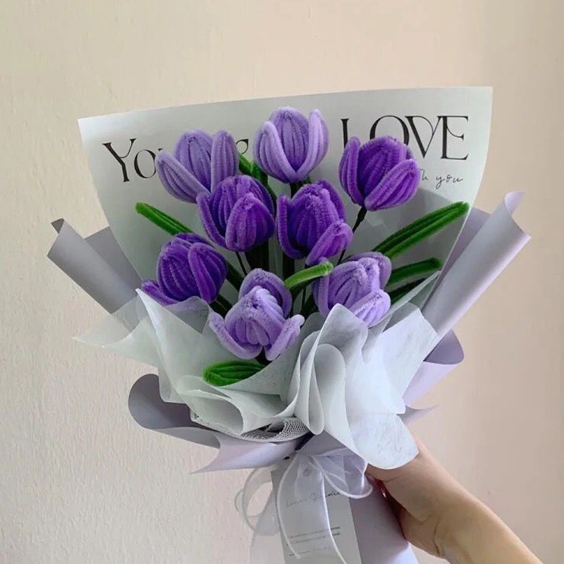 女子の日のチューリップの綿毛は棒の花束の完成品のdiyの材料をねじってバレンタインデーのdiyの誕生日を包みます。