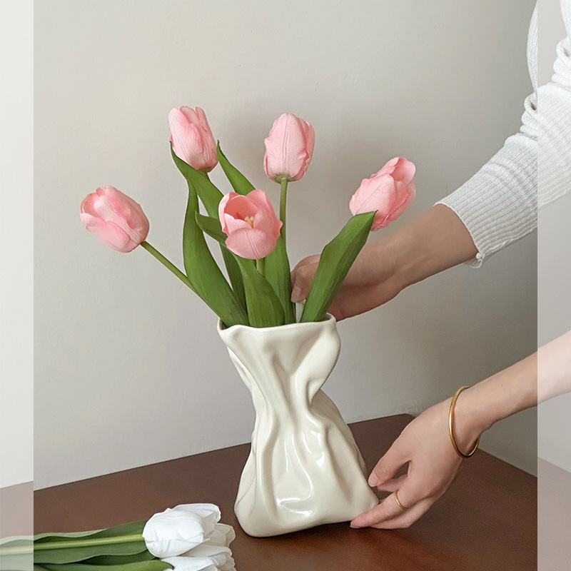 高級保湿手触りチューリップシミュレーション花造花しわ折り紙陶磁器花瓶玄関デスクトップ装飾置物
